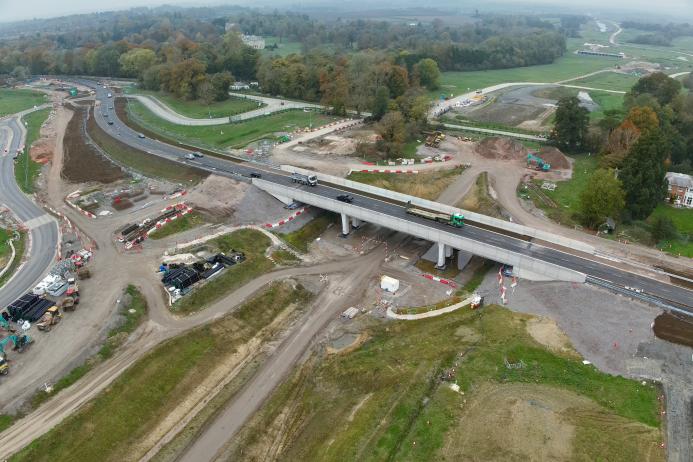 The A418 road bridge near Aylesbury has reopened after a week-long closure, marking the completion of its realignment over the HS2 route, with 21 U-shaped precast concrete beams used to form the three spans of the new bridge.