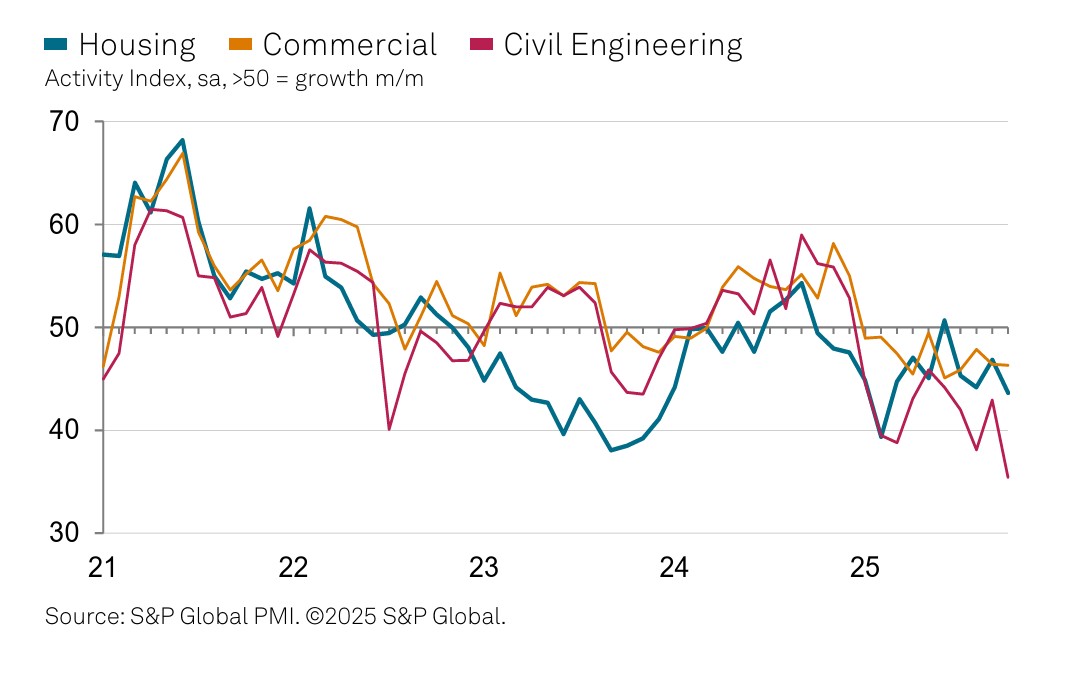 Civil engineering was the weakest-performing segment (index 35.4), followed by residential building (43.6), which saw its sharpest fall in eight months. Commercial work proved more resilient, registering 46.3 — little changed from September.